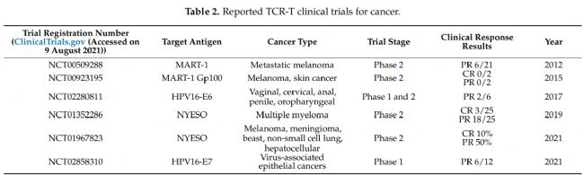 靶向TAAs 的MART-1和NY-ESO-1 TCR-T療法在晚期黑色素瘤、骨髓瘤和非小細胞肺癌中也顯示出臨床療效。完成的TCR-T臨床試驗的總有效率(ORR)在0~60%之間。值得注意的是,這些TCR-T臨床試驗中的大多數都只入組了少量患者(2至25名),因此ORR在統計上可能不太準確。因此,需要更大規模的II期和III期臨床試驗來確認這些TCR-T療法的實際臨床療效。