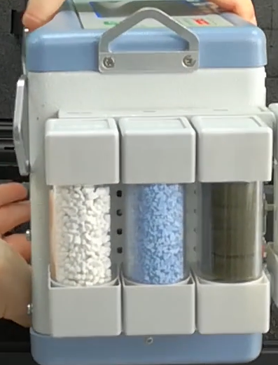 新試劑顏色如下圖:左邊白色為CO2吸收劑,大約2/3變成棕褐色就需要更換,不可重復使用;中間藍色是干燥劑,大約2/3變成粉色也需要更換,可以烘干重復使用。