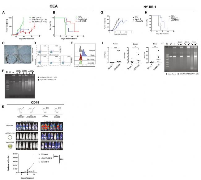 以CEA為例,研究人員用PGK (phosphoglycerate kinase) 啟動子和人癌胚抗原CEA替換掉GFP,構建了SP-nS/MARt-CEA,用電穿孔轉染構建CAR-T細胞。與用慢病毒載體比較,新載體CAR表達水平更高,在腫瘤縮小、腫瘤生長延遲、延長生存期,腫瘤浸潤率等方面都更優,但兩者都沒有徹底清除腫瘤,原因是出現腫瘤逃逸,腫瘤細胞抗原丟失。這在臨床治療中很常見。RCA方法檢測證實載體以質粒形式存在,沒有整合到染色體上。處理40天后將轉染細胞與腫瘤細胞混合培養依然顯示強大的抗腫瘤活性。另外兩種腫瘤模型都顯示出新載體制備CAR-T細胞效果優于,至少效果不輸給現有方法,而具有持久表達,遺傳風險小,制備簡單快捷這些優勢就更不用說。