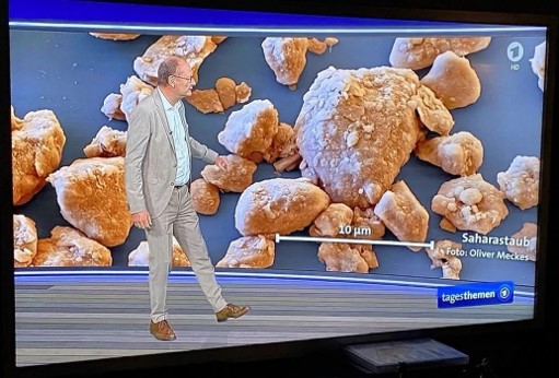藍(lán)色曲線顯示撒哈拉沙塵暴發(fā)生前不久的粒徑分布。綠色和紅色曲線顯示沙塵事件發(fā)生時(shí)的尺寸分布。它們因天氣條件而異。例如,在同時(shí)有降水的情況下(綠色曲線),顆粒分布總體上雖然有所增加,但僅在 < 1µm 的范圍內(nèi)---較粗的顆粒被雨水沖刷得更多,因此幾乎不會(huì)升高。紅色曲線顯示了沙塵的典型分布, 1-10 µm 范圍內(nèi)顆粒明顯增加。在從撒哈拉沙漠穿越南歐到北歐的漫長旅程中,撒哈拉沙漠的塵埃和氣溶膠粒徑分布也因當(dāng)?shù)靥鞖鈼l件而發(fā)生變化。