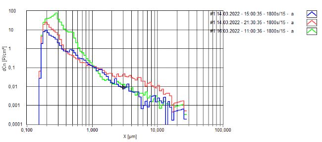 由于降雨,大部分撒哈拉沙塵被沖刷為降水,而造成紅色雨水的原因是由于顆粒中的高氧化鐵含量造成了如圖1所示的微紅色顆粒。測量到的粒經(jīng)大小在 1-10 µm 范圍內(nèi),由于粗粒徑顆粒在氣溶膠狀態(tài)下的停留時(shí)間并不長,所以就需要有精準(zhǔn)的儀器來進(jìn)行測量。Palas®在德國卡爾斯魯厄通過 AQ Guard 空氣質(zhì)量監(jiān)測儀測量的粒徑尺寸分布。下面是在卡爾斯魯厄測量的三種尺寸分布的示例(圖 2 和圖 3)。