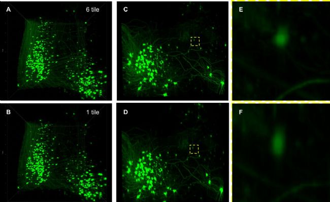 使用锘海LS18平鋪光片顯微鏡對透明化Thy1-eGFP 小鼠脊髓成像(6.3X),分別使用平鋪6次(6 tile,上行圖像)和1次(1 tile,下行圖像)模式進行對比,如圖橫向(A-B)和軸向(C-D)更大強度投影(MIP)。(C)和(D)中選定區(qū)域(黃色)的放大視圖分別為(E)和(F),即使是較小胞體的形態(tài)在6 tile模式下依舊清晰可辨,但是在1 tile模式下會丟失部分信息,但是毫無疑問1 tile的速度相比于6 tile模式至少可提升6倍之多!