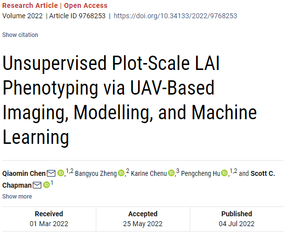 近日,Plant Phenomics在線發表了昆士蘭大學題為Unsupervised Plot-Scale LAI Phenotyping via UAV-Based Imaging, Modelling, and Machine Learning的研究論文。