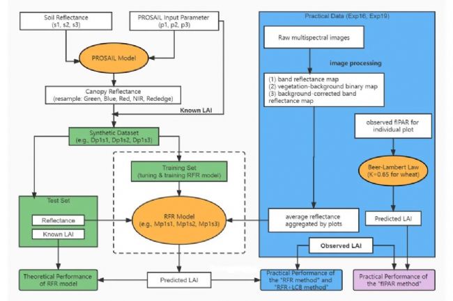 本文基于混合方法理論發展了一個預測模型,用以實現從無人機多光譜成像捕獲的冠層反射率中對不同生長條件下小麥的LAI進行快速精準估計的目的。這個模型基于隨機森林回歸(RFR)算法建立,在經過輻射傳輸模型生成的模擬數據集上訓練得到。這就使得該模擬在實際應用中的估計精度,極大地取決于模擬光譜數據和實測光譜數據的相似性,因此本文通過土壤反射率校準和光譜影像背景校正來提高模擬和實測光譜數據的相似性(圖1)。