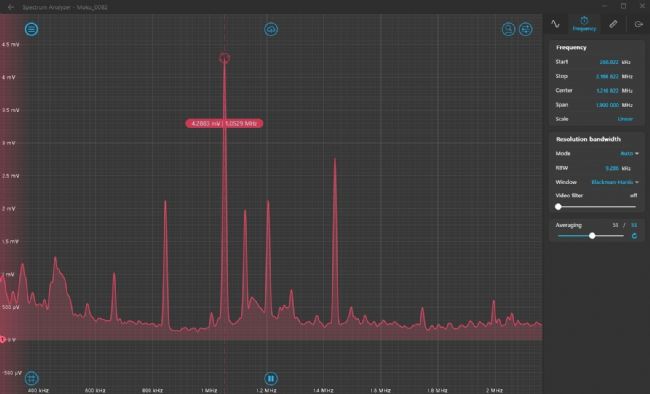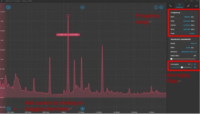 找到最主要的調幅無線電信號頻率,你可以通過添加一個跟蹤光標來完成。信號應在小于2 MHz的范圍內。