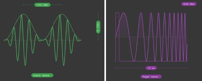 圖2 使用Moku:Go上的波形發生器的調幅波形和調頻波形示例。