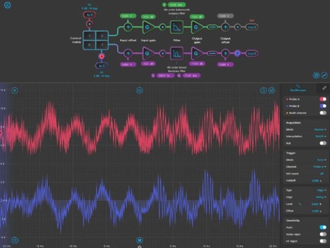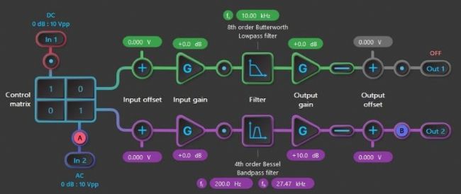 將探針A添加到輸入2,將探針B添加到輸出2。首先,將濾波器改為貝塞爾帶通濾波器,并根據需要改變增益。改變頻率,僅隔離信息信號,即音樂或聲音,從而嘗試去除低頻噪音。試著瞄準音樂和聲音產生的頻率。圖14給出了堪培拉地區的數字濾波器盒變量。