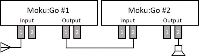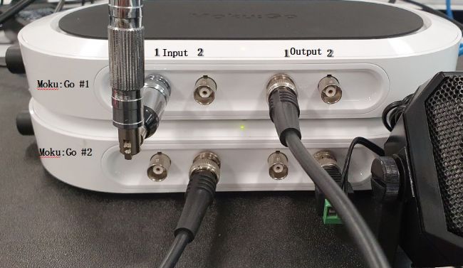 將揚聲器連接電纜移至Moku:Go #2的輸出2。將一根電纜從Moku:Go #1的輸出1連接到Moku:Go #2的輸入2。這種設置可以在圖11和圖12中看到。