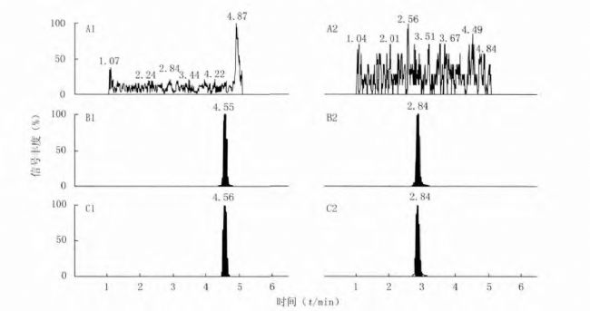 A:空白透析液;B:空白透析液+環磷酰胺對照品(0.1μg/ml)+內標安替比林(1.0μg/ml);C:微透析液樣品;A1、B1、C1:環磷酰胺;A2、B2、C2:安替比林