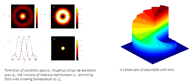 傳統的方法可以用螺旋相位板來產生這樣的渦旋光束,但是使用純相位空間光調制器產生這樣的渦旋光,具有更高的靈活性。通過改變拓撲荷數就可以改變空心區域的面積,從而產生不同大小的損耗光,來提升STED系統的分辨率。