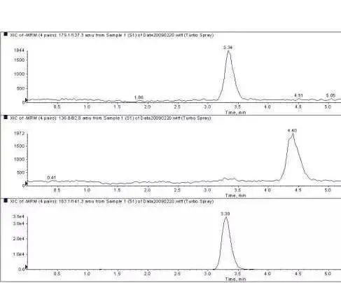 質譜定量分析,使用的一般是LC-MS/MS,不使用LC-MS, 看一下質荷比,推測下分子量。UV可以用來定量,但是在有紫外吸收的干擾峰的時候,定量是不準的。LC-MS/MS使用母離子/子離子來進行定量,相對來說,干擾要少的多,也比較準確,在PK/TK的應用很廣泛。這里只有LC-MS/MS定量的譜圖,僅供參考!183.1/141.3 通道的是內標,其他的兩個是化合物。