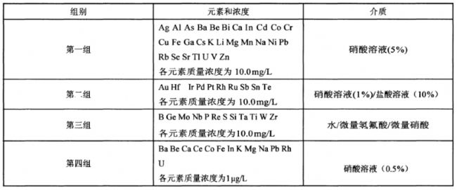使用有證多元素溶液標準物質或按GB/T 602規定制備,互有化學干擾、產生沉淀及互有質譜干擾的元素應分組配制。分組實例見表1,表中所用溶液以“%”表示的均為質量分數。