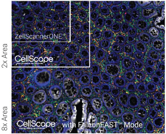 CellScape系統(tǒng)在光學系統(tǒng)上做了明顯提升,可以觀測的視野范圍是上一代產(chǎn)品ZellScanner ONE的2倍,因此可以在相同的時間內(nèi)獲得兩倍的數(shù)據(jù)量,同時圖像分辨率更高。全新的FalconFAST™ 模式,甚至可以將視野范圍提高8倍,同時保持高質(zhì)量的光學分辨率,實現(xiàn)單細胞定量。