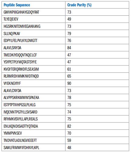 為了證明,使用配置有 HT24 的 Liberty PRIME 2.0 合成了一組 20 種已發表的新抗原肽 1,2,它們具有不同的序列,平均長度為 16 個氨基酸殘基。 這組肽的總合成時間為 24 小時 14 分鐘。 使用 CarboMAX™ 以 0.1 mmol 規模合成肽,得到的粗肽純度為 47% – 90%,平均純度為 69%(表1和圖1)3。