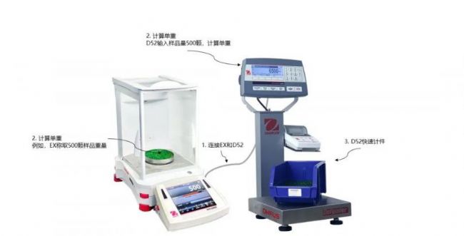 先用EX天平測定500顆玻璃珠樣品的總重量。通過RS232連接線, EX自動將總重量傳輸給Defender 5000,防止人工輸入產生的差錯;