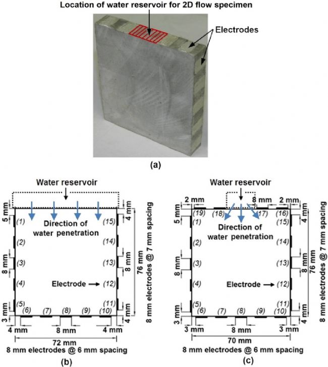 電阻抗斷層成像(EIT)是一種成像方式,可以提供一個(gè)強(qiáng)大的工具來(lái)監(jiān)測(cè)混凝土中的水分流動(dòng)。在EIT中,三維(3D)分布的使用一組電流注入和電極電勢(shì)測(cè)量來(lái)成像電阻率。EIT已被用于監(jiān)測(cè)土壤中的水分滲透。