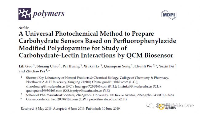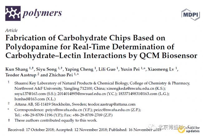 Shang K, Song S, Cheng Y, et al. Fabrication of Carbohydrate Chips Based on Polydopamine for Real-Time Determination of Carbohydrate⁻Lectin Interactions by QCM Biosensor. Polymers (Basel). 2018;10(11):1275. Published 2018 Nov 16. doi:10.3390/polym10111275