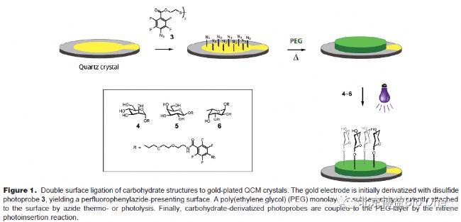 三個單糖均含有PFPA結構,利用PFPA的再次插入反應,將糖分子插入PEG分子,從而將糖分子修飾到芯片表面。