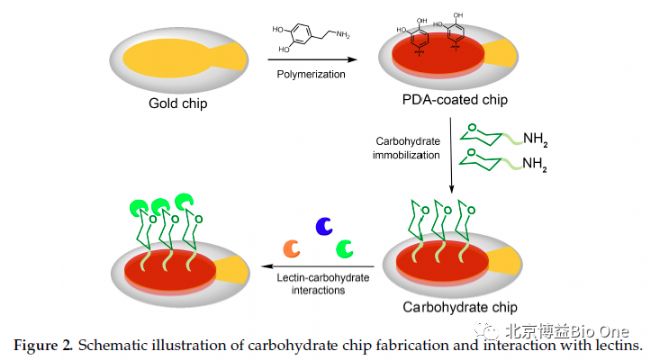 通過Schiff base 或者 Michael addition反應使氨基化碳水化合物固定在聚多巴胺涂層芯片表面,得到碳水化合物修飾的芯片。