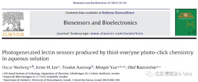 Oscar Norberg, Irene H. Lee, Teodor Aastrup, Mingdi Yan, Olof Ramström, Photogenerated lectin sensors produced by thiol-ene/yne photo-click chemistry in aqueous solution, Biosensors and Bioelectronics, Volume 34, Issue 1, 2012, Pages 51-56, ISSN 0956-5663,