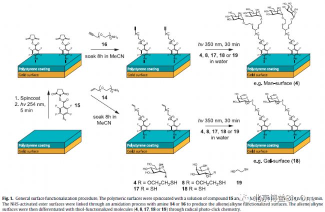 1、實驗概述:利用PFPA(一種全氟苯疊氮化物)將糖分子修飾到芯片表面,研究糖與凝集素之間的相互作用。