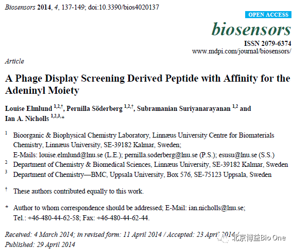 Elmlund L, Söderberg P, Suriyanarayanan S, Nicholls IA. A phage display screening derived Peptide with affinity for the adeninyl moiety. Biosensors (Basel). 2014;4(2):137‐149. Published 2014 Apr 29. doi:10.3390/bios4020137