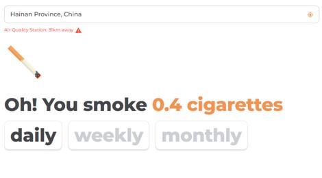 空氣中的PM2.5顆粒物的粒徑僅2.5微米。因為這些顆粒足夠小,可以深入肺部進入血液,并引發心臟病、中風、肺癌和哮喘等疾病危害到人們的健康。同時人們深諳吸煙對身體健康的危害,一家著名的環境機構通過環境監測數據報告,設計了一款應用程序,通過將空氣質量與吸煙的數量聯系起來,將空氣污染與吸煙行為造成的危害進行對比,對空氣污染的健康影響進行了深入分析,以幫助人們了解空氣污染對健康的影響。其結果直觀且引人注目,通過該應用程序可查看不同地區的空氣污染信息。