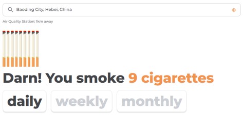 例如在一天內的監測中,海南的空氣污染程度相當于一天吸0.4支香煙,系統提示當前的空氣質量令人滿意,空氣污染很少或沒有風險,人們可以享受平常的戶外活動;而保定的空氣污染程度則相當于一天吸9支香煙,系統提醒目前的主要空氣污染物PM2.5可能影響身體健康,人們應減少戶外活動,特別是弱勢人群。由此可知空氣污染在一些城市是一個不容樂觀的現狀,人們需要時刻關注空氣污染所帶來的傷害。