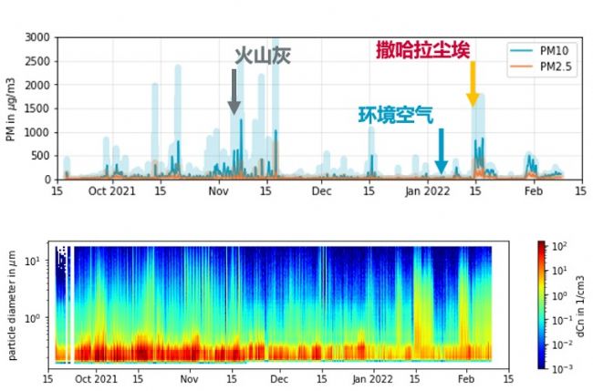 AQ Guard Smart監測到的火山灰和撒哈拉沙塵PSD成相圖