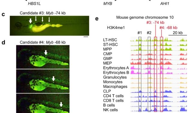 By analyzing multiple sets of ChIP-seq data, we selected several candidate cis-regulatory elements of the key hematopoietic regulator gene Myb. We exploited zebrafish as an in vivo validation model, and identified 2 enhancer regions active in zebrafish hematopoietic organs (Fig. 1). Then we generated transgenic mice with an EGFP reporter construct linked to these elements and confirmed their specificity in mouse hematopoiesis.