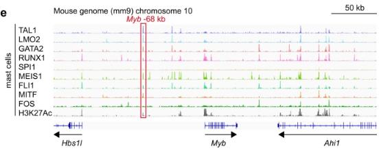 Furthermore, analysis using ChIP-seq datasets from bone marrow-derived mast cells29 showed that not only multiple HSC-related transcription factors but also the key mast cell regulator MITF bound to the Myb -68 enhancer (Fig. 3e), suggesting the activity of the Myb -68 enhancer driven by MITF in mast cells.