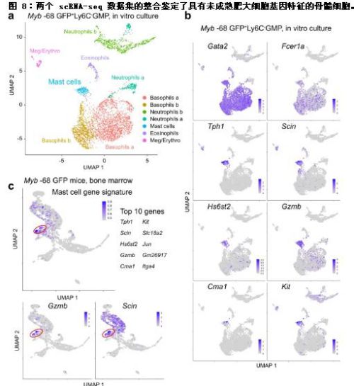 a UMAP visualization of in vitro mast cell culture. FACS-sorted Myb -68 GFP+ FcεR1α-Ly6C- GMPs were cultured with IL-3 for 3 days, and then analyzed. Clusters were annotated according to the expression of known feature genes. b UMAP projection of selected mast cell signature genes. c UMAP projection of the mast cell gene signature (upper) and selected mast cell genes (lower). The top 10 marker genes to characterize immature mast cells (upper right) were determined using scRNA-seq data of in vitro mast cell culture, and enrichment of the gene signature in bone marrow GFP+ cells in Myb -68 GFP mice was calculated by gene set variation analysis. Cells with enrichment of the mast cell gene signature were shown in red. Cells were displayed in order of expression to prevent cells with high expression from getting buried.