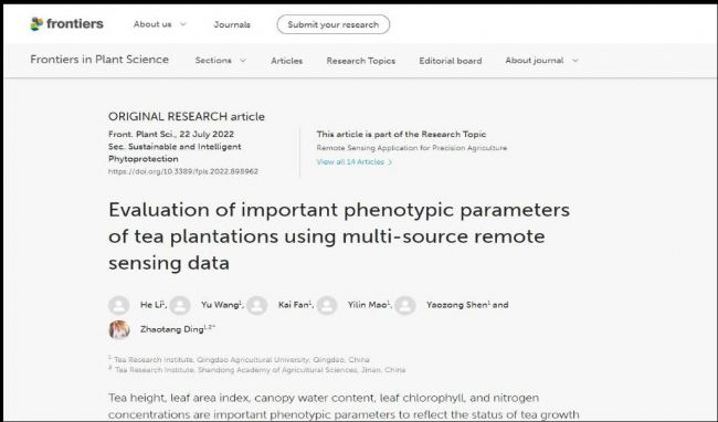 [1] 論文信息:Li H, Wang Y, Fan K, Mao Y, Shen Y and Ding Z (2022) Evaluation of important phenotypic parameters of tea plantations using multi-source remote sensing data. Front. Plant Sci. 13:898962. doi: 10.3389/fpls.2022.898962.