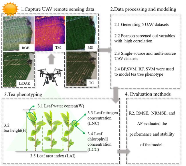 此研究表明,利用無人機多光譜相機等傳感器,結合機器學習建立模型,可以實現對茶樹主要結構和功能性狀的有效檢測,從而為茶園管理提供了一條可能的高效技術路徑。