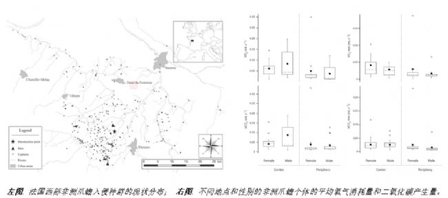 法國國家科學研究中心和渥太華大學生物系的研究人員通過對法國境內不同區域非洲爪蟾標準代謝率(SMR)的分析,來進一步探討外來入侵物種的生理變化和入侵潛力。研究結果表明非洲爪蟾的SMR與個體大小和體重之間存在正相關,較小和較輕的爪蟾個體都具有較低的SMR,而且性別和體重之間存在顯著的交互作用。法國境內山脈中心區域的雄性SMR高于雌性,而外圍區域的雌性SMR則高于雄性。來自外圍地區的雌性非洲爪蟾具有相對較高的SMR(與雄性相比)很可能是由于其繁殖過程需要大量的能量成本,用以支持種群向邊緣區域不斷擴張。從保護生物學的角度來看,這些結果證明了理解生物和進化機制的重要性,這些機制是選擇性狀的基礎,可以用于評估外來物種的入侵潛力。