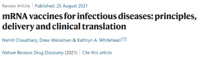【1】Chaudhary N, Weissman D, Whitehead KA. mRNA vaccines for infectious diseases: principles, delivery and clinical translation. Nat Rev Drug Discov. 2021 Nov;20(11):817-838.