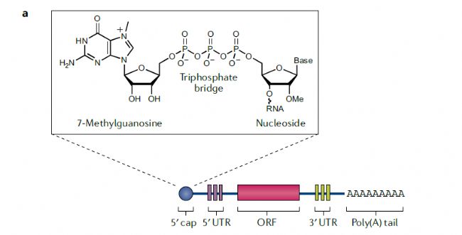 5’端帽的作用之一是防止mRNA被細胞中識別病毒RNA的傳感器發現,從而預防意外的免疫反應。它還在空間上保護mRNA免受核酸外切酶的降解。3’ poly A尾的長度間接調節mRNA的轉譯和半衰期。5’和3’UTR調節mRNA的轉譯、半衰期和細胞內定位。對UTR的工程化設計可以改變mRNA的細胞定位,或者降低mRNA的降解。