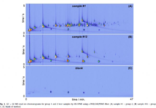 搭建GC×GC-MS分析平臺對市場上的啤酒進(jìn)行風(fēng)味組學(xué)研究,研究成果發(fā)表在色譜A雜志[1]。