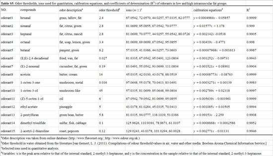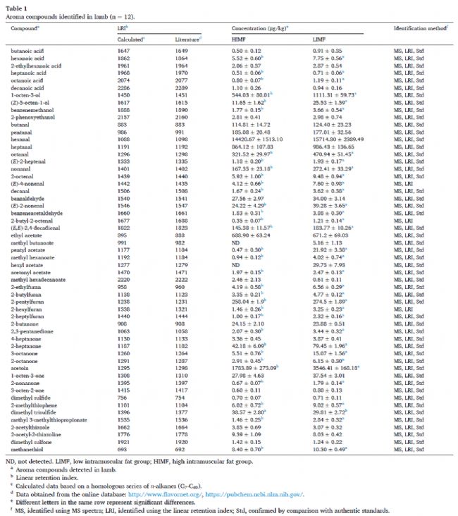 表2-1. 羊肉中識別鑒定得到的55種芳香化合物