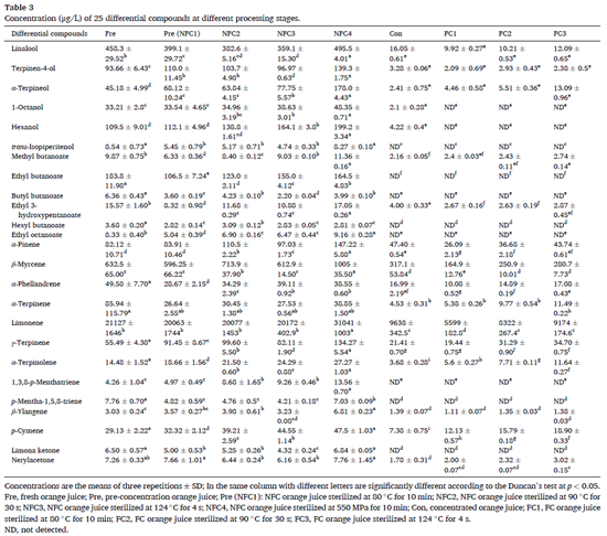 結(jié)合果汁加工階段探討了25種關(guān)鍵化合物的具體變化,結(jié)果表明濃縮處理是導(dǎo)致 NFC 和 FC 橙汁揮發(fā)性成分差異的關(guān)鍵加工步驟,濃縮處理后,F(xiàn)C橙汁中這些化合物的濃度顯著降低;熱滅菌導(dǎo)致的變化程度遠(yuǎn)小于濃縮。