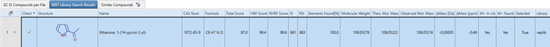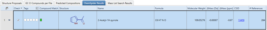 ChemSpider節(jié)點(diǎn)進(jìn)行化學(xué)式檢索,得到的匹配結(jié)果信息為2-乙酰基吡咯,這與EI定性結(jié)果一致。