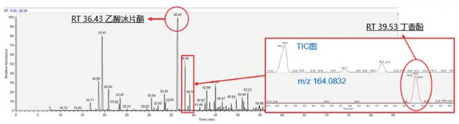 圖5-3. 精油樣品TIC圖:①主要成分,RT=36.43,乙酸冰片酯;②痕量組分,RT=39.53,丁香酚。