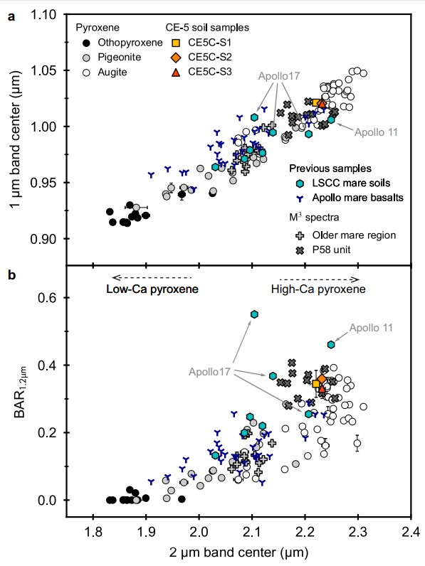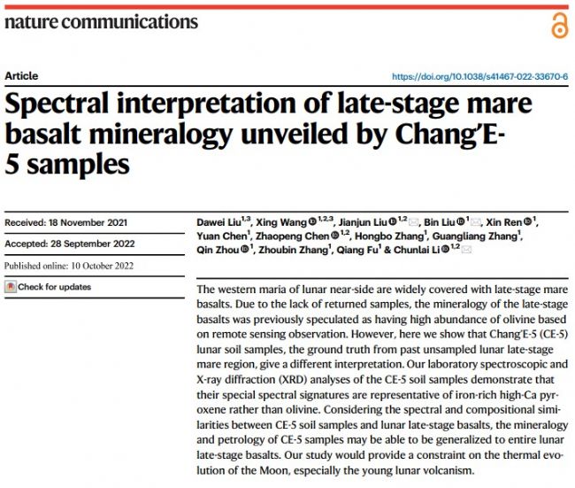 北京時間2022年10月10 日,國際科學期刊《自然 · 通訊》(Nature Communications)在線發布我國嫦娥五號樣品的一項研究成果。中國科學院國家天文臺李春來、劉建軍研究員領導的團隊,結合嫦娥五號月球樣品的實驗室分析結果和遙感探測數據,解答了過去對月球晚期玄武巖遙感光譜解譯的疑惑,糾正了月球晚期玄武巖獨特遙感光譜特征的物質成分解譯結果。