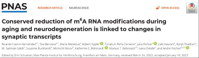 Castro-Hernández R,et al. Conserved reduction of m6A RNA modifications during aging and neurodegeneration is linked to changes in synaptic transcripts. Proc Natl Acad Sci U S A. 2023 Feb 28;120(9):e2204933120.