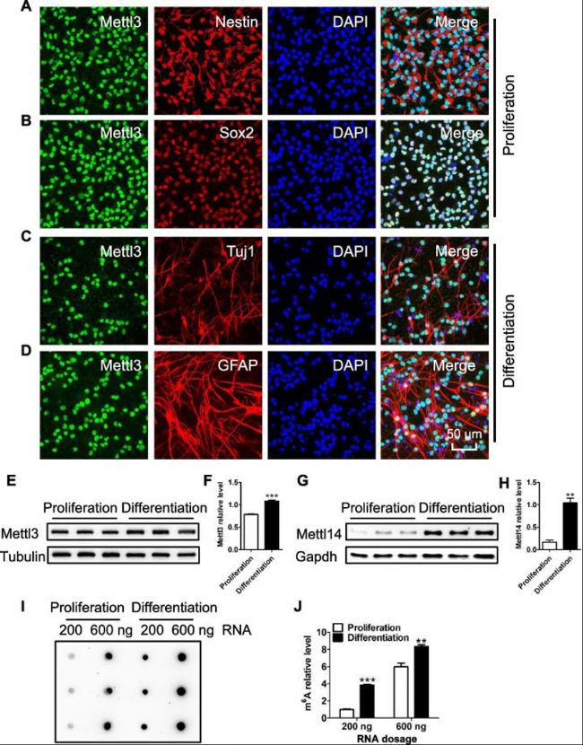 (A-D)神經(jīng)干細胞增殖和分化中mettl3表達動態(tài)的免疫熒光觀察