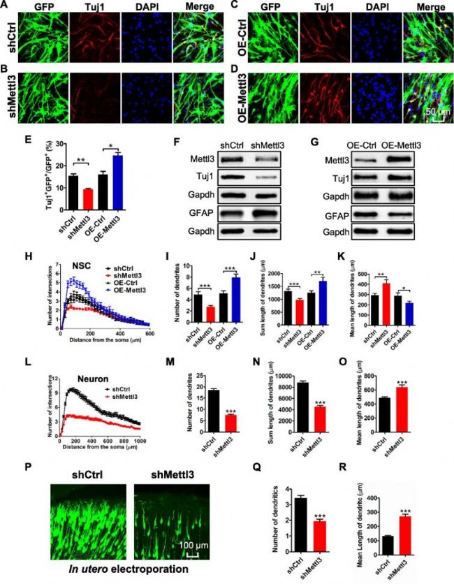 (I-K)原位電穿孔圖像分析mettl3沉默對神經(jīng)元的數(shù)量和長度的影響