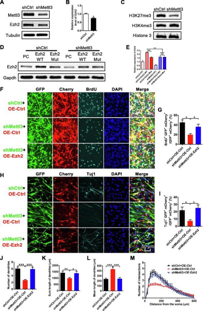 m6A甲基化酶由Mettl3和Mettl14組成,是mRNA中最豐富的RNA修飾,參與多種生物過程。然而,m6A修飾在調(diào)控神經(jīng)元發(fā)育和成體神經(jīng)形成中的作用和確切機制尚不清楚。在本研究種,作者檢測了Mettl3在小鼠神經(jīng)元發(fā)育和成體神經(jīng)形成中的功能,結果發(fā)現(xiàn)Mettl3沉默導致成體神經(jīng)干細胞(adult neural stem cells,ANSC)中m6A修飾水平顯著下調(diào),并影響了細胞增殖。Mettl3沉默不僅影響神經(jīng)元發(fā)育,使ANSC分化更傾向于膠質(zhì)細胞系,而且還影響了新生神經(jīng)元的形態(tài)成熟。m6A-seq(MeRIP-seq)測序分析結果顯示m6A修飾主要富集在與神經(jīng)形成和神經(jīng)元發(fā)育相關的轉錄本中。從機制上講,m6A修飾存在于組蛋白甲基轉移酶Ezh2的轉錄本上,mettl3沉默導致Ezh2蛋白表達水平下調(diào),ChIP實驗證明H3K27me3水平下調(diào)。免疫熒光觀察發(fā)現(xiàn),mettl3沉默引起的神經(jīng)細胞增殖和分化缺陷可被Ezh2過表達所回復。總之,研究結果揭示了RNA修飾和組蛋白修飾之間的串擾,并表明Mettl3介導的m6A修飾通過調(diào)節(jié)組蛋白甲基轉移酶Ezh2表達在調(diào)控成體神經(jīng)形成和神經(jīng)元發(fā)育中發(fā)揮重要作用。