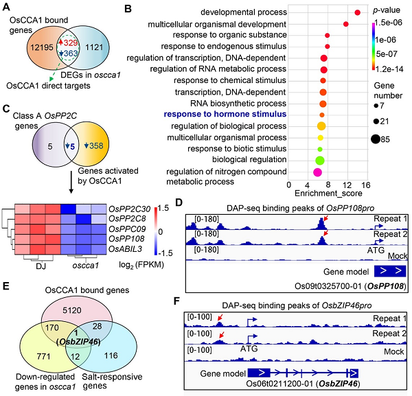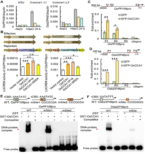 圖4. OsCCA1直接結合OsPP108和OsbZIP46的啟動子,并激活其轉錄。
