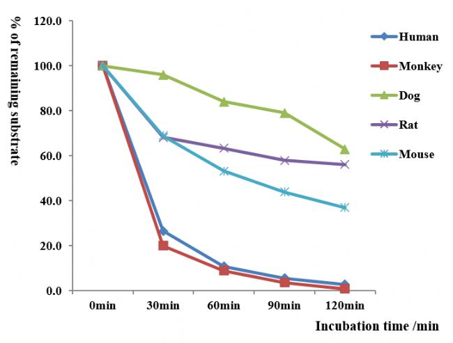 圖2 某藥物在不同種屬動物肝微粒體中的I相代謝穩定性