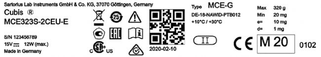 可以通過其標識牌(也稱為“銘牌”)上的標簽來識別已檢定的天平。在歐洲,除了指明儀器型號和序列號外,該標簽還包括型號、精度等級、以及CE標記旁邊的所謂補充計量標記(以M表示),其相鄰的最后兩位數字表示合格評定年份。